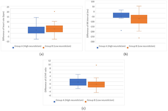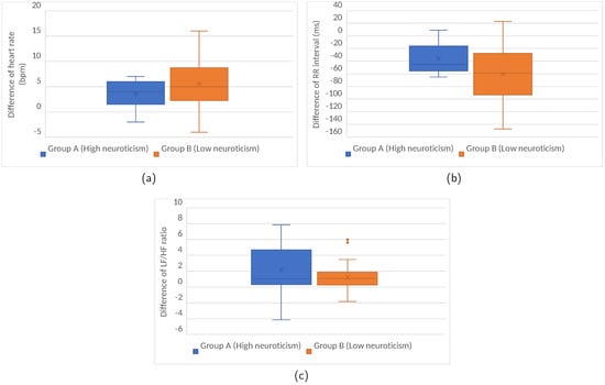 Difference of HRV between the driving and relaxation phases according to the neuroticism level in Germany. (a) Heart Rate; (b) RR Interval; (c) LF/HF ratio.