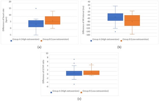 Difference of HRV between the driving and relaxation phase according to the extroversion level in Germany. (a) Heart Rate; (b) RR Interval; (c) LF/HF ratio.