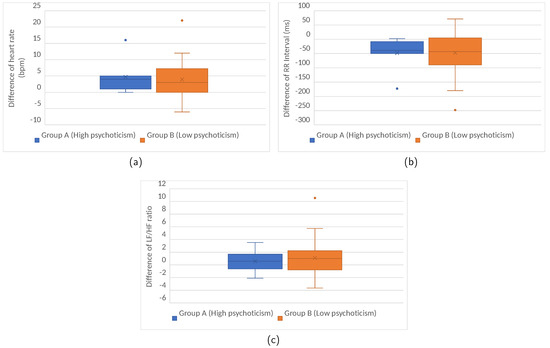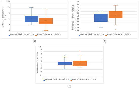 Difference of HRV between the driving and relaxation phase according to the psychoticism level in Spain. (a) Heart Rate; (b) RR Interval; (c) LF/HF ratio.
