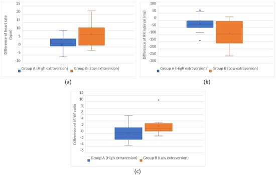 Difference of HRV between the driving and relaxation phase according to the extroversion level in Spain. (a) Heart Rate; (b) RR Interval; (c) LF/HF ratio.