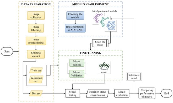 Firstly, we begin with a data preparation stage, which involves the collection, labeling, preprocessing, and splitting of data. This stage ends with the labeled samples divided into three data sets: train, validation, and test. In the second stage, a set of pre-trained models is chosen and implemented in MATLAB version 9.9.0 (R2020b), The MathWorks Inc., Natick, MA, USA. One is selected for a fine-tuning stage, for which the inputs are the training and validation sets and the output is a trained model. Hence, the fine-tuned model is used to classify new images from the test set. The prediction results are then evaluated with classification metrics, and the next model is chosen from the aforementioned set to restart the second stage. Once all pre-trained models have been tested, a comprehensive performance evaluation is conducted based on the metric scores, thereby concluding the workflow.