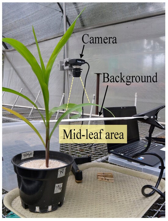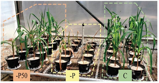 The images of nutrition-deficient maize leaves (Zea mays L. improved variety ICA—V 109) used in this study were collected from mid-June to early August 2022 in a plastic shed from the area of Natural Systems and Sustainability of Universidad EAFIT, Medellin, Colombia (6°11′53.80″ N, 75°34′43.23″ W). The experimental design followed a scheme comprising ten replications of three phosphorus levels: P absence (-P), half dose (-P50), and complete supply (C), resulting in a total of 30 plants (see Figure 2).