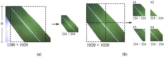 The original images obtained with the scientific camera underwent automatic size processing using Python (version 3.8.8, Python Software Foundation, Wilmington, DE, USA) code with two concurrent methods: (1) All pixel original images were cropped to a central square with sides equal to the smallest image side (n), i.e., 1020 px. Then, cropped images were resized to pixels according to the method shown in Figure 5a. (2) All images cropped to a central square were subsequently divided into four individual images with a size of pixels each. Similarly, these cropped images were resized to pixels. The process is shown in Figure 5b.