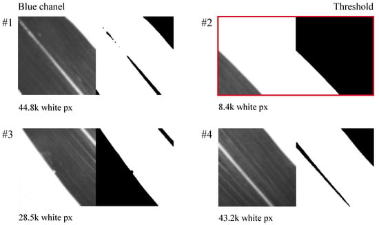 Selection process for images obtained through quadrant division. Each image shows the separated blue channel (left) and the result of thresholding (right). The number of white pixels at the bottom of each image represents the leaf content. A minimum count of 15k white pixels is considered as the threshold for determining the presence of relevant information. ‘#1’ to ‘#4’ are the resulting images after quadrant division. In this example, only image would be filtered out.