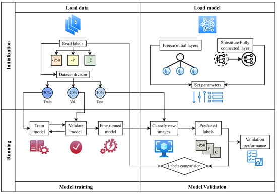 The computer code is executed on a machine equipped with an i7-9700K 3.6 GHz processor, 64 GB RAM (Intel, Santa Clara, CA, USA), and an NVIDIA GeForce RTX 2080 40 GB GPU (Santa Clara, CA, USA). To apply the transfer learning approach for each model, the following process is performed (see Figure 7):