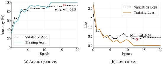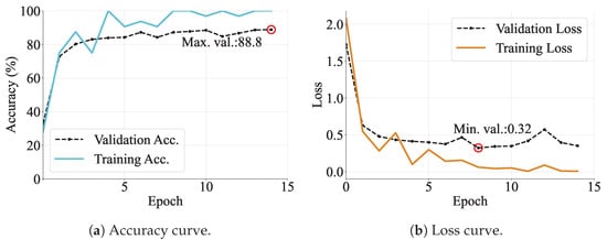 Training and validation curves for the VGG16 architecture specifying (a) accuracy and (b) loss in every epoch. The maximum accuracy value and the minimum loss are also reported.