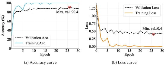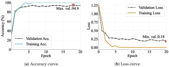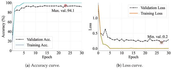 Training and validation curves for the MobileNetV2 architecture specifying (a) accuracy and (b) loss in every epoch. The maximum accuracy value and the minimum loss are also reported.
