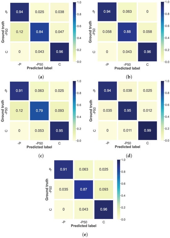 Normalized confusion matrices to evaluate the accuracy of prediction results for: (a) VGG16, (b) ResNet50, (c) GoogLeNet, (d) DenseNet, and (e) MobileNet models.