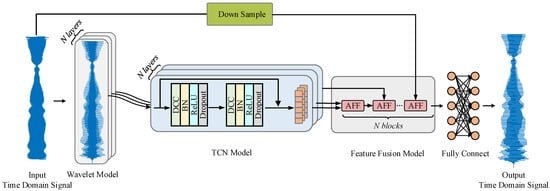 The Wavelet-TCN-AFF model in this paper is shown in Figure 1. The model consists of four components: a wavelet transform module, a TCN feature extraction module, a stacked AFF feature fusion module, and a predictor. Initially, the time-domain signal from the antenna aperture is taken as the input signal and decomposed into coefficients representing different frequency components through the wavelet decomposition module. In the second step, the TCN model extracts the corresponding features of each frequency component from each layer of coefficients, which will be used as local features of the signal. Concurrently, to avoid loss of some global features of the original signal after wavelet transformation, we compress the input signal through pooling operations to obtain its global features. Thirdly, the stacked AFF module is used to fuse local and global features across different frequency scales. Finally, the predictor, consisting of fully connected layers, predicts the time-domain signal output of the receiver’s video end based on the fused features. This output time-domain signal is the interference response of the receiver, representing the model’s prediction of the time domain waveform at the receiver’s video output. The following sections provide a detailed introduction to each component of the WTA model.