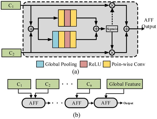 Inspired by the work of [27], an Attention Feature Fusion (AFF) block was introduced to fuse the features of multiscale frequency components. The AFF structure is shown in Figure 3. The AFF module performs initial feature fusion on two input features, such as C1 and C2, and then processes them through channel attention calculations for both local and global features. The channel attention for local features begins with a point-wise convolution applied to the input feature X. This convolutional step, employing a 1 × 1 kernel, primarily serves to modify the channel dimensions of the input feature map which can be described as