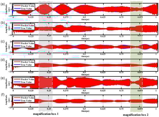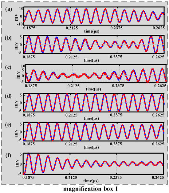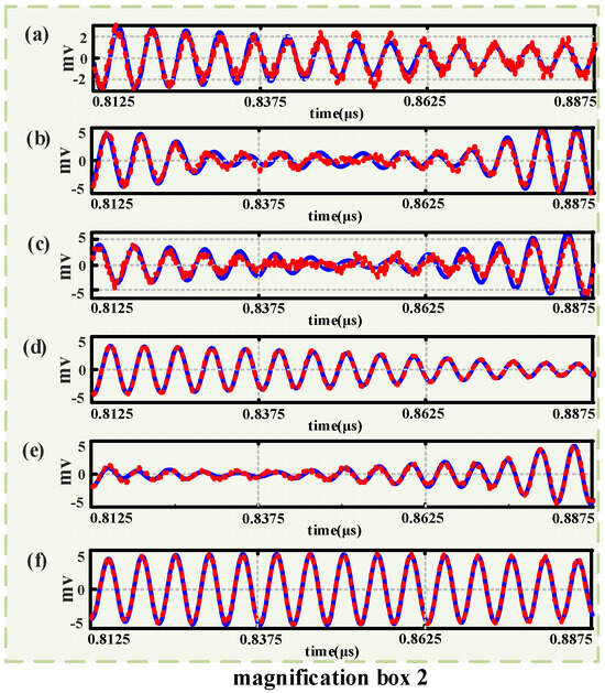 To verify the effectiveness of the proposed model under different interference conditions, we present in Figure 5 the time-domain waveforms of the video end output under various interferences from (a) to (f), respectively representing NLFM, QPSK, LFM, CW, BPSK, and BFSK interferences. The ordinate represents the amplitude of the signal, and the ordinate represents the time. In the Figure 5, the blue solid line is the time-domain signal (target value) which represents output from the video end of the receiver, and the red solid line is the prediction result based on the model proposed in this paper. In order to display the results of numerical implementation in more detail, the local interval marked by the dotted line box is enlarged, as shown in Figure 6 and Figure 7. The solid blue lines and dotted red lines in Figure 6 and Figure 7 represent the same meaning as in Figure 5. It can be seen that the predicted results are very close to the observed results. In (a), the Nonlinear Frequency Modulation (NLFM) interference is characterized by a central frequency offset of 3 MHz, a bandwidth of 3 MHz, and an amplitude of 15 dBm. In (b), the Quadrature Phase Shift Keying (QPSK) interference presents with a central frequency offset of 4 MHz, a bandwidth of 3 MHz, and an amplitude of 5 dBm. For (c), the Linear Frequency Modulation (LFM) interference features a central frequency offset of −5 MHz, a bandwidth of 5 MHz, and an amplitude of 15 dBm. In (d), the Continuous Wave (CW) interference has a central frequency offset of −3 MHz and an amplitude of 5 dBm, (e) involves the Binary Phase Shift Keying (BPSK) interference, which has a central frequency offset of 5 MHz, a bandwidth of 5 MHz, and an amplitude of −5 dBm. Lastly, in (f), the Binary Frequency Shift Keying (BFSK) interference is identified with a central frequency offset of 0 MHz, a bandwidth of 5 MHz, and an amplitude of 5 dBm.