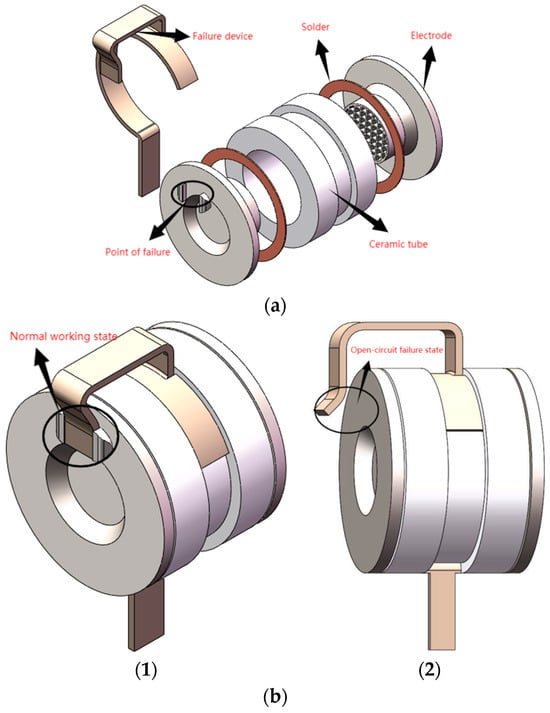 The conventional GDTs have a narrow application scope in the protection of power supply systems due to their weak capability of SC damage prevention. To improve line protection when overcurrent faults of GDTs occur and avoid ignition of GDTs under an SC condition, we explored the relevant studies on EOFGDTs and developed a new type of EOFGDT based on the thermal properties of discharge plasma actuation. The structure of this new type of EOFGDT is shown in Figure 1a. This EOFGDT was formed from a ceramic tube, of which ports were closed through both ends, two-end electrodes that were welded to the tube via solder joints in the form of pads, and an external failure device limited to the outer surface of the tube. The inner surface of the two-end electrodes formed a discharge gap inside the tube, while an elastic sheet extended from the end electrode on the side of the failure device to the outer surface of another-end electrode and was connected to the surface by the solder, which in a normal state is presented in Figure 1b(1). When the SC follow currents run through the tube, the generated arcs will increase the electrode temperature due to continuous combustion and heat transfer, resulting in the failure of the solder. The elastic sheet was thus disconnected from the end electrode to form an external gap, which reduced the rising speed and amplitude of the recovery voltage across the arc gap so that an OC was formed in the EOFGDT structure, as shown in Figure 1b(2). The failure device was provided with a pin that formed two discharge electrodes with the end electrode at the opposite end. In this study, the OC failure mode was applied to the tube to seek a solution to the existing ignition risks when GDT faults occur.