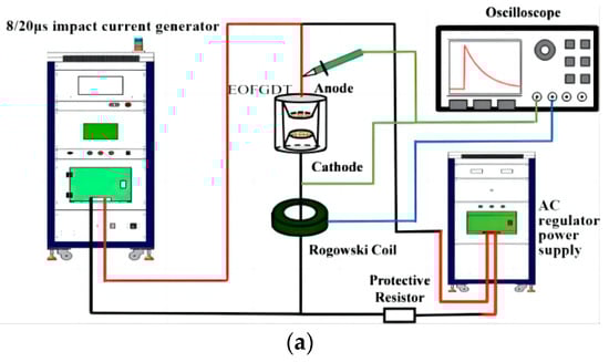 The prepared EOFGDT sample was chosen as the target of the following experiment to understand its current interruption characteristics, while impulse currents were applied to both ends of the EOFGDT to simulate the real working scenario. The theoretical scheme and physical environment of the EOFGDT OC response (also, failure response) experiment under power-frequency SC follow currents are shown in Figure 2. The EOFGDT we developed classified as a Class II surge protective device, so we selected an 8/20 µs impulse current that met the IEC 61643-11 standard to conduct experiments on the EOFGDT. The experimental circuit was mainly composed of an 8/20 µs impulse current generator, an AC power supply, a GDT, an oscilloscope, a Rogowski coil, a high-voltage differential probe, and a protective resistor (1 Ω/1000 W). The protective resistor also served as the sampling resistance. The EOFGDT had a DC breakdown voltage of 600 V and an arc voltage of 30 V, the size of the device was Φ 8 × 9, and the area of the failure point was 4 mm2. The 8/20 µs impulse current generator had an output voltage of 0–20 kV and an output current of 0–10 kA. Due to experimental and equipment limitations, we chose an AC power supply with adjustable output voltage and current, ranging from 0–480 V and 0–30 A, respectively.
