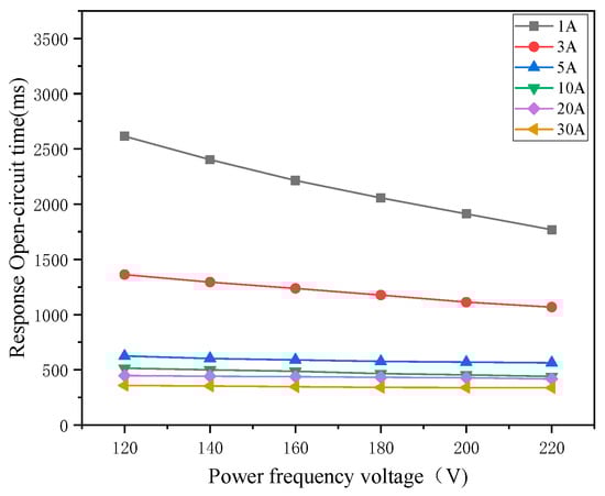When the SC current was less than 3 A, the OC response time was more than 1000 ms. When the SC current was larger than 5 A, the EOFGDT OC response time was about 600 ms. The rate of change of OC response time was less between the different voltages. This was because the heat transfer of the electrode reached a limit when the power-frequency current reached a certain value, and the heat was enough to make the failure device function. When the SC current was greater than 30 A, the EOFGDT OC response time was about 300 ms. Therefore, we recommend the EOFGDT for application in scenarios where the SC current is large.