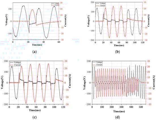 Voltage-current relationship and diagram of the EOFGDT time to open-circuit failure mode under different power-frequency voltages. (a) The power-frequency voltage was 90 V; (b) The power-frequency voltage was 100 V; (c) The power-frequency voltage was 110 V; (d) The power-frequency voltage was 120 V.