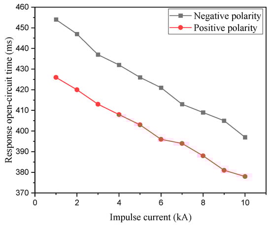 Curves of the EOFGDT OC response time under impulse currents with different polarities and different sizes (the power-frequency voltage was 120 V, and the SC current was 20 A).