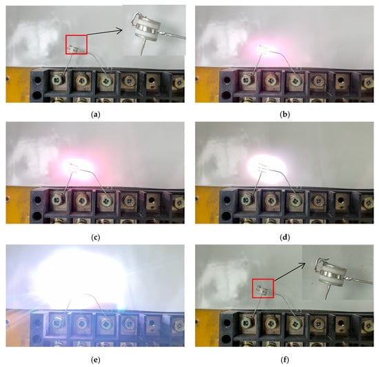 In order to verify the performance of arc extinguishment of EOFGDTs and its effectiveness, the impulse-coupling SC test was conducted by connecting the discharge tube and the protective resistor in a series. The experimental equipment was an 8/20 µs impulse current generator coupled to a 120 V/20 A AC power supply. The action pictures of the EOFGDT under the SC currents captured by the high-speed camera are shown in Figure 6. Figure 6a shows that at t = 0 ms, the EOFGDT suffered from an 8/20 µs impulse surge. Figure 6b shows that the EOFGDT emitted dazzling light, and the EOFGDT was broken through. Figure 6c,e show the formation of the external gap. Since the power supply voltage was larger than the arc voltage of the EOFGDT, the EOFGDT produced the follow currents, and the SC current reached 10 A. The charged particles in the discharge path were accelerated and collided with the surface of the electrode. The kinetic energy was transformed into pulsed force and then into thermal energy that heated the intended part on the surface of the electrode so that the alloy of the solder joint was immediately melted or gasified, leading to the disconnection of the failure device and the formation of the external gap. Figure 6f shows that due to the short action duration, the solder material sputtered when strong reverse momentum was generated and the arc was extinguished, and the EOFGDT was completely removed. Therefore, the power-frequency SC follow currents of the EOFGDT were cut off at about 450 ms. This was consistent with the waveform results obtained with our test at a power-frequency voltage of 120 V and an SC current of 20 A.