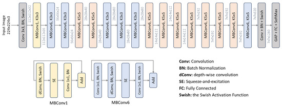 Figure 2 illustrates the architectural design of EfficientNet-B0 [29,30,31,32]. It leverages depth-wise separable convolutions known for computational efficiency. Also, the innovative incorporation of MBConv blocks introduces a fusion of depth-wise separable convolutions, squeeze-and-excitation mechanisms, and shortcut connections. This amalgamation empowers EfficientNet-B0 with a robust and expressive feature extraction capability.