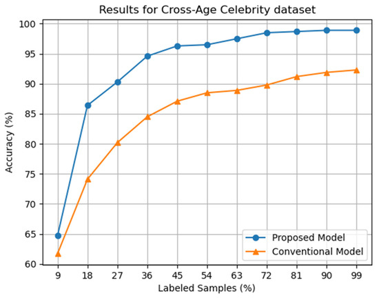 Classification accuracy vs. percentage of labeled data samples for proposed and conventional models on the Cross-Age Celebrity dataset.