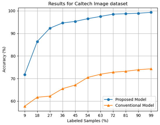 Table 2 provides a statistical depiction of accuracy, precision, recall and F1 score at different fractions of labeled data taken from the entire training set of the Caltech Image dataset. Our proposed model outperforms the conventional model in terms of both classification accuracy and the proportion of labeled data samples. Figure 4 illustrates a comparison of the classification accuracy of the proposed model and the conventional model on the Caltech Image dataset as the percentage of labeled training samples is increased.