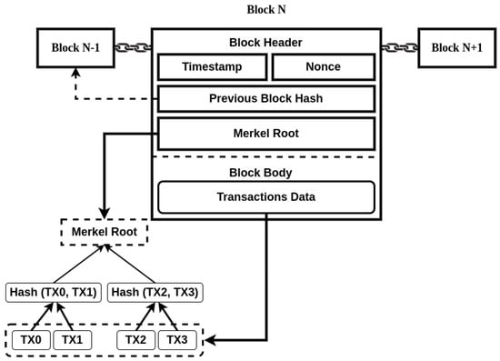 A blockchain is a decentralized and distributed ledger made of a sequence of blocks linked to each other. Each block contains a list of transactions, and each transaction is a record of an event or action. The block header, which includes the previous block hash, timestamp, nonce, and Merkle root, identifies each block. The previous block hash links the current block to the previous one. The timestamp verifies the data in the block and assigns a time or date of creation for digital documents. The nonce, a number used only once, is a central part of the proof of work in the block. The Merkle root, a type of data structure frame for different blocks of data, stores all the transactions in a block by producing a digital fingerprint of the entire set of transactions. This structure provides assurance that once data are recorded in a block, they cannot be altered in the future without modifying all subsequently recorded blocks, making blockchain transactions immutable and secure. Figure 1 represents an overview of the blockchain structure with the chain of blocks that encapsulate the transactions and secure them with hashes and other data. These blocks are broadcasted and replicated across a network of peers. This method is characterized by its robust security measures through cryptographic principles, which effectively mitigate the risks of manipulation and fraudulent activities. The decentralized nature of blockchain enables universal accessibility of the distributed database to all participants in the network, which is governed by a consensus algorithm. Therefore, blockchain data are immutable; it additionally traces and validates transactions based on their origins. This technique makes digital transactions transparent, secure, and tamper-proof. Considering these unique characteristics, blockchain is an appropriate mechanism for integration with e-voting systems.