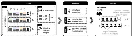 The output is a structured array of teams, each with assigned members. The algorithm maintains equitable scores across teams while maximizing individual member satisfaction. For an in-depth discussion on the objective function and additional details, refer to Section 5.5. The process is graphically represented in Figure 2.