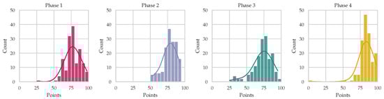 After each project phase, students were evaluated and graded by TAs. The grading criteria were based on quantifiable aspects, such as the volume of work completed, project deliverables, and the overall quality of the work. Rather than team grades, individual grades were assigned on a scale from 0 to 100. These grades were communicated to each student during a meeting with the TA and their respective team. The distribution of these grades across different phases is illustrated in the histograms shown in Figure 3.