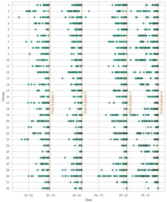 After these preprocessing steps, the commit count was refined to 28,466, representing approximately 48% of the initial volume. A visual representation of the filtered commit activity across teams is shown in Figure 4. The vertical dashed orange lines represent the deadlines for individual phases.