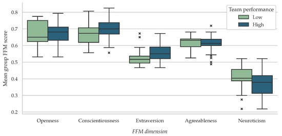 We define team performance as the arithmetic mean of grades in each project phase. Using the median performance as the separation criterion, teams were classified as high-performing or low-performing teams, as depicted in Figure 5. The variations in FFM dimensions between these groups were statistically significant and aligned with previous research, confirming the following: