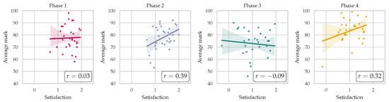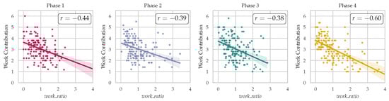 Using as , team satisfaction was calculated for each project phase, and the results are depicted in Figure 6. Phases 2 and 4 showed a notable positive correlation between team satisfaction and performance, with correlation coefficients of and . However, Phase 1 exhibited a weak or non-existent relationship, possibly due to initial adjustments among team members. Phase 3’s average scores were 5 points lower than the first two phases, leading to reduced satisfaction levels, particularly when outcomes did not meet expectations.