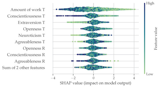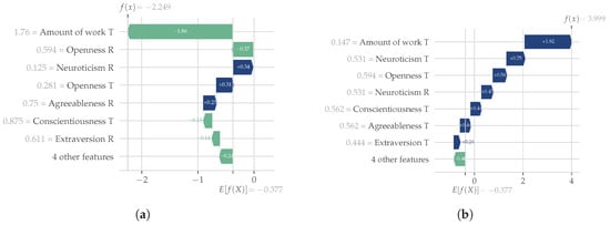 The two SHAP waterfall plots in Figure 9 were created to assess how the model works. In the negative classification example, we can see that the low amount of work (5× less than expected) performed by the target student was the main reason for the negative classification but above-average neuroticism also contributed. In the positive classification example, we can see that the high amount of work nudges the classification to be positive. At the same time, the interplay between the Raters’ and Target’s FFM dimensions cancels out.