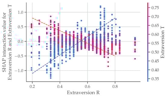 SHAP dependence plot of Raters’ (R) and Targets’ (T) extraversion. The dashed lines represent a linear fit applied to the most prominent data points from opposite extremes.
