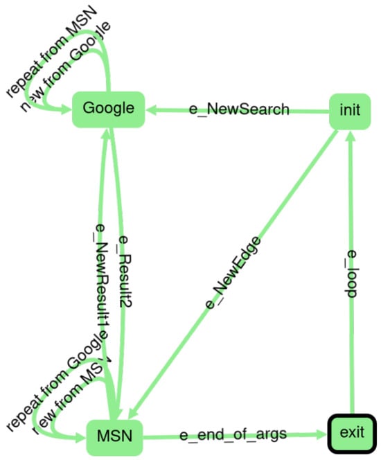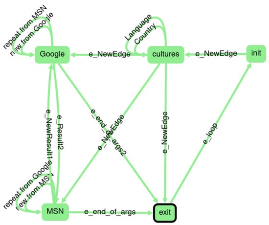 - Redesign the GraphWalker diagram with more details (i.e, new edges or vertexes), and input variables (paying attention to the parts of the graph that have not been covered before, if any), and go back to Section 4.3 to generate new test suites from the GraphWalker tool. The initial GraphWalker diagram is refined by adding a new state (cultures) to allow for different values in Country and language, as well as adding new transitions related to this new state. Additionally, new input conditions are added with information about the availability of each search engine(av_msn(true/false) and av_google(true/false)). The refined GraphWalker diagram of Metasearch can be observed in Figure 3.