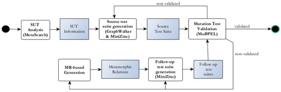 - de Castro-Cabrera, M.C.; García-Domínguez, A.; Medina-Bulo, I. Using constraint solvers to support metamorphic testing. In Proceedings of the 4th International Workshop on Metamorphic Testing, Montreal, QC, Canada, 26 May 2019; Xie, X., Poon, P., Pullum, L.L., Eds.; IEEE: Piscataway, NJ, USA, 2019; pp. 32–39. [Google Scholar] [CrossRef]