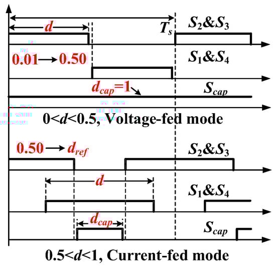 Figure 3 shows the theoretical waveforms of the proposed soft-start scheme in the range of 0.00~0.50 and 0.50~dref. The driving signals of S1 and S4, and of S2 and S3, are the same. Ts is the switching cycle. As shown in Figure 3, the switch in the snubber circuit is always opened because the duty ratio dcap is equivalent to 1, and d, the duty ratio, is employed to provide voltage to the output side from the capacitor Ccap. Then, the current-fed full-bridge DC-DC converter acts as a buck converter. So, the output voltage of the H bridge can be slowly increased from 0 V, and the in-rush current can be omitted. Moreover, as shown in Figure 3, when the duty ratio d is bigger than 0.5, there are some overlaps of the switches in the same half bridge, and the current-fed full-bridge DC-DC converter is transferred to the current-fed mode. The duty ratio d is employed to regulate the output voltage. Furthermore, dcap is smaller than 1, and is employed to pre-charge the leakage inductance. Thus, when the dc-link inductance current is close to the leakage inductance current, the soft connection of the dc-link inductance and the leakage inductance can be realized.