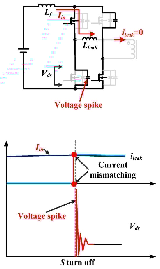Figure 7 shows the generation mechanism of the voltage spikes. As mentioned before, there are two inductances in the circulating loop in the current-fed full-bridge DC-DC converter. So, the connection of these two inductances is required. Then, if the currents in the filter inductor and leakage inductor do not match but are directly connected during the switching off action, the switches on the current-fed side will suffer from high voltage spikes. The voltage spikes will usually damage the switch components. Thus, the snubber circuit is required for the current-fed full-bridge DC-DC converter.