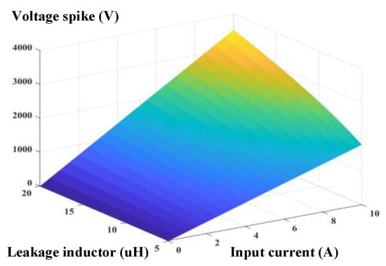 The value of voltage spikes can be calculated using Equation (1) [33]. As shown in (1), the voltage spikes can be obtained via the parasitic capacitors of the switch Coss, the time constant ω, the leakage inductance Lleak, and the original currents (Iin(0) and ileak(0)). For example, when the parasitic capacitors of switches S1~S4 are 80 pF (C3M0060065K), the relationship between the voltage spike, the different input currents Iin, and the leakage inductor Lleak can be shown as Figure 8. As shown in this figure, the instantaneous voltage value can reach a level that is thousands of times the rated voltage. Then, the switches will be damaged by these voltage spikes. Thus, a snubber circuit is necessary for a current-fed full-bridge converter to avoid voltage spikes.