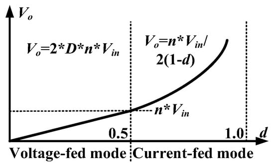The converter characteristics are the same as those of an isolated buck converter in soft-start mode and an isolated boost converter in normal boost mode. According to the voltage-second balance of filter inductor Lf, the converter conversion ratio can be derived as Equation (2) [15,16]. Then, the theoretical target value of duty ratio d at the rated working point is given in Equation (3), and the turn ratio of the output voltage can be drawn as Figure 9.