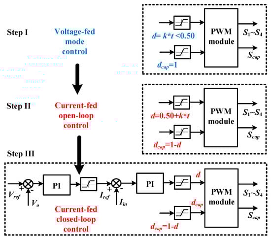 As shown in Figure 10, in step I, the current-fed full-bridge DC-DC converter is configured in the voltage-fed mode, and the duty ratio d increases linearly from 0.00 to 0.50. The voltage-fed mode is utilized to establish an initial output voltage at the beginning of the start-up process. When the duty ratio d reaches 0.50, the output voltage Vo reaches close to n*Vin, and the converter is switched to the current-fed mode. Furthermore, the current-fed full-bridge DC-DC converter is operated in the current-fed mode as step II. Then, in step II, the duty ratio d continues to rise linearly from 0.50 to the target value dref, which can be calculated as Equation (3). When the duty ratio d reaches the target value dref, the output voltage is close to the desired value, and the soft-start process is able to enter step III. In this step, a dual-loop PI controller is utilized to regulate the output voltage, with the outer voltage loop and the inner current loop [11]. Vref and Iref are the reference values of output voltage and input current, respectively. In order to realize the close-loop control, the output voltage and the input current are measured. Then, based on the desired output voltage Vref and the output voltage Vo, the desired input current Iref can be obtained through the PI controller. Further, by combining the desired input current Iref and the input current Iin, the duty ratio can be obtained through the inner PI controller. Furthermore, duty ratio dcap is employed to control the switch of the snubber circuit.