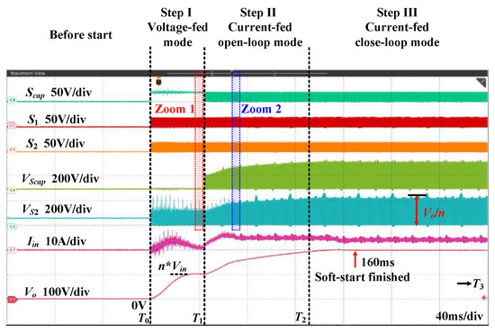 As shown in Figure 11, there are three steps in the proposed hardware-simplified soft-start scheme for the current-fed full-bridge DC-DC converter. During step I (T0~T1), the converter operates in voltage-fed mode, and the duty ratio d increases linearly with open-loop control. At the instant T1, the duty ratio d reaches 0.50, and the output voltage Vo reaches close to n*Vin. Notably, the voltage spikes Vs2 of switch are caused by the hard switching, and are smaller than double the input voltage Uin. During step II (T1~T2), the converter is switched to current-fed mode from voltage-fed mode. The output voltage Vo continuously increases. During step III (T2~T3), the closed-loop controller intervenes in controlling the duty ratio d, and finally, the output voltage is stable at the reference value. During the whole soft-start process, the drain-source voltage VS2 on the current-fed side switches (e.g., S2) is always within a safe area Vo/n, consistent with the analysis in Section 2.3 The time taken for the soft start is about 160 ms, and is affected by the filter inductor value and the speed at which the duty ratio increases. Finally, the hardware-simplified soft-start scheme can be realized for the current-fed full-bridge DC-DC converter.