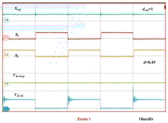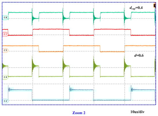 Moreover, Figure 12 shows the experimental waveforms of Zoom I. As shown in this figure, the magnified waveforms for the voltage-fed control mode can be obtained, where the phase-shift modulation method is employed. The snubber switch Scap is always turned on to damp the current increase in filter inductance Lf. Figure 13 demonstrates experimental waveforms of Zoom 2, and the typical waveforms for the current-fed modulation can be obtained. The oscillation is caused by the inherent hard switching of the current-fed converter, which is generated by the leakage inductance and the parasitic capacitor of the switches.
