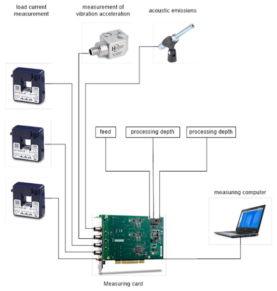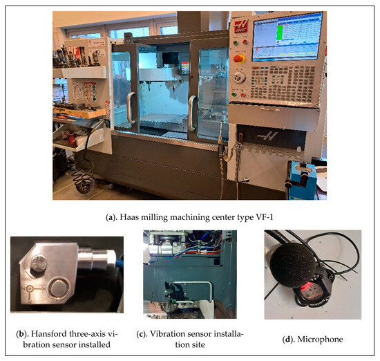 Vibration measurements were taken near the machine spindle. A three-axis Hansford sensor with a sensitivity of approximately 100 mV/g was selected. The design of the milling spindle made it impossible to install the vibration sensor directly inside the machine’s working chamber. The sensor was installed in the place closest to the spindle bearing after removing the machine covers. For this reason, it was decided to install an independent acoustic signal source inside the machine’s working chamber. A microphone with a sensitivity of approximately 50 mV/Pa was selected. An additional parameter measured was the power consumption of the milling machine from one of the phases. A current transformer with a sensitivity of approximately 10 mV/A AC was used to record from this source. The cables from the above-mentioned transducers were secured and routed to the measurement system consisting of signal conditioners, a measurement card, and a laptop with installed data visualization and recording software. The system was calibrated using calibrated reference signals. To ensure the reliability of the obtained data, the new sensors were tested on dedicated calibration stations. The entire measurement track was calibrated with standards independently before each series of measurements.