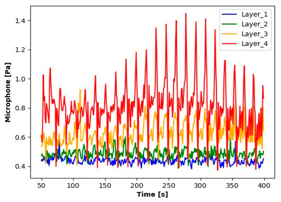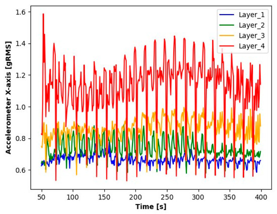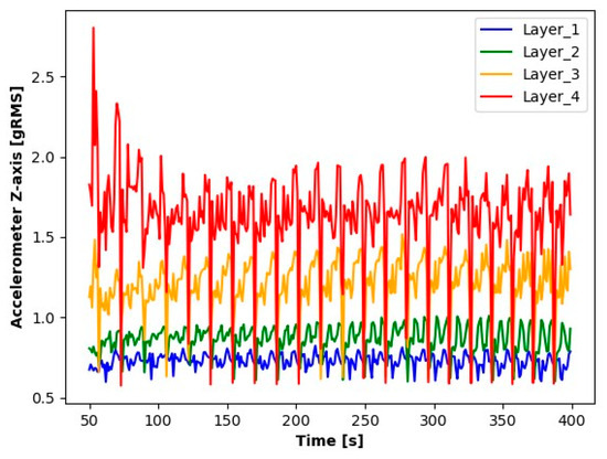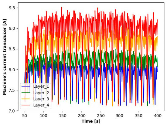 The first step in the initial analysis was signal processing. For each layer to be analyzed, the signal readings were divided into sequences containing 10.000 elements (a sequence contains a 1 s signal reading). The average values of these series were determined for the accelerometer, as were the absolute average values for microphone signals. For the current transformer, averages were determined from the absolute values of the readings. The signal processing results (averages for each second) for the first sample during seconds 50 to 400 are shown in the Figure 3, Figure 4, Figure 5, Figure 6, Figure 7 and Figure 8.