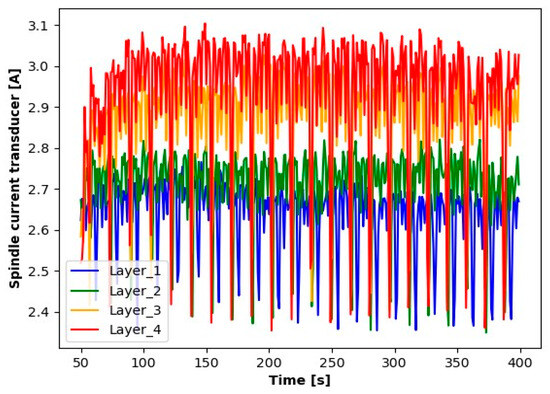 The results presented suggest observable differences in the signal values for each layer. When analyzing the graphs, clear differences in the averages for each of the signals tested are noticeable. Particularly for Layer 1, it can be observed that the average signal values are significantly smaller compared to the other layers. An increase in the average values for the subsequent layers suggests a process of wear of the cutting tool.
