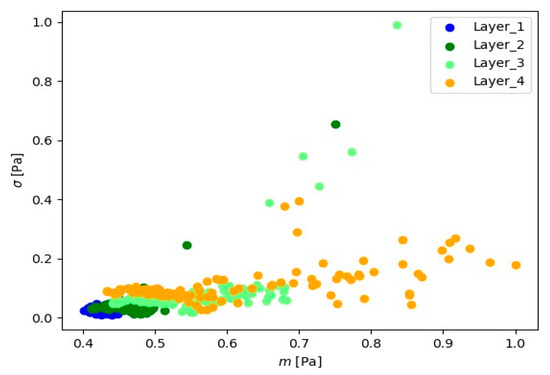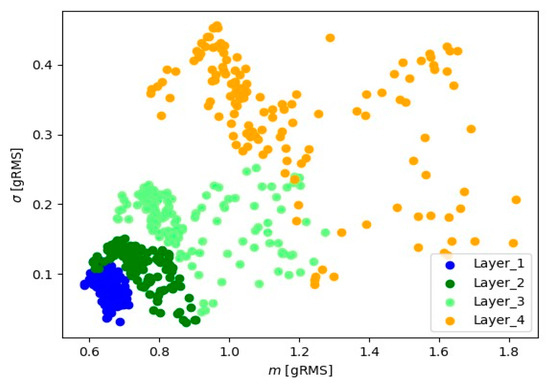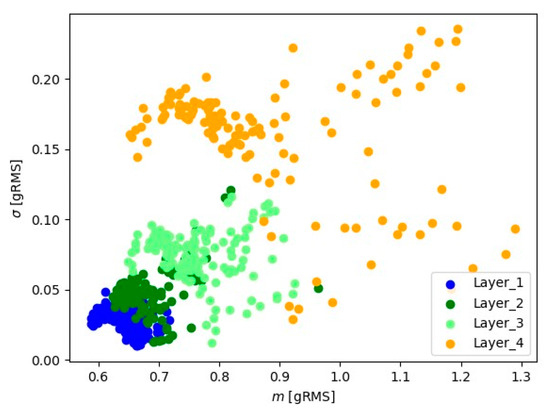 Let denote the sequence of average values from one-second readings, i.e., the value of the is the average of 10,000 signals obtained from the sensor. The analyzed is the one-second sequences of averages for , is the integer part of the number. For second sequences , the mean value and the variance for every layer were determined: