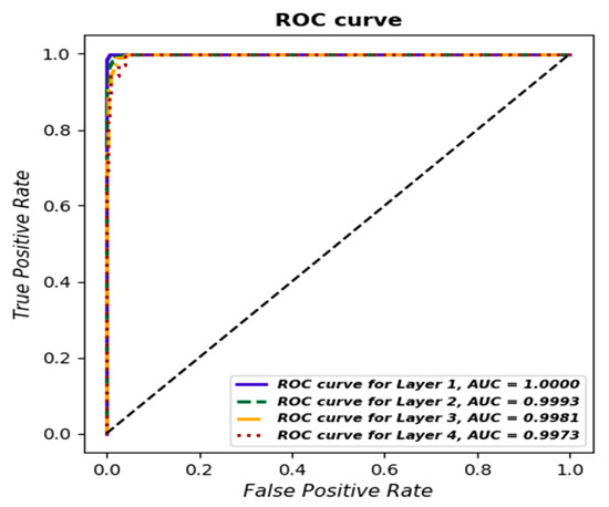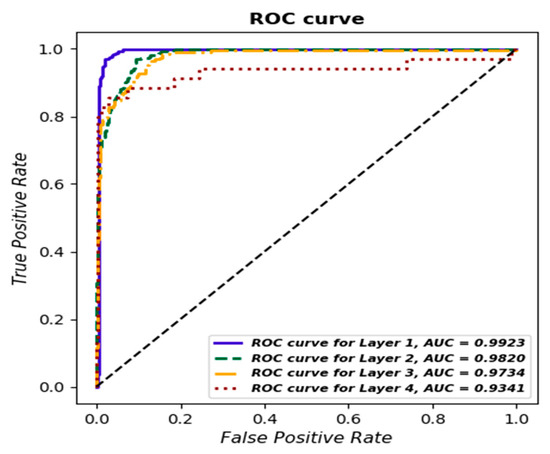 Analysis of the results for the gradient boosting classifier reveals the classifier’s excellent ability to effectively identify individual classes. The sensitivity (Recall) for each of the layers (Layer 1–4) remains at an impressive level of over 95%, demonstrating the classifier’s ability to effectively identify instances of a particular class from among all actual instances of that class.