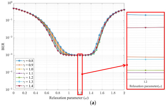 Next, we will explore MOR detectors that can be applied to 4G and B5G multi-carrier technologies. To obtain the appropriate relaxation parameter and acceleration parameter , we first used Equations (23) and (24) to obtian the preliminary relaxation parameter and acceleration parameter . Apart from this, as shown in Figure 6 and Figure 7, the acceleration parameter and relaxation parameter are depicted for different relaxation parameter values and acceleration parameter values for our proposed method in the OFDM and UFMC, respectively, comparing the BER performance graphs when the iteration number i was 4, was , and the SNR was at 35 dB. We can observe in Figure 6a,b that if was the curve of , the BER performance would improve, whereas the BER performance would decrease, and the best BER performance was when was equal to . Similarly, we also observed the same values of and in Figure 6 and Figure 7. In light of this, choosing a value close to and value close to would have the best estimate. Meanwhile, the experimental simulation data in Figure 6 and Figure 7 were consistent with the theoretical calculation values of Equations (23) and (24). It is worth noting that regardless of whether the MOR operated in the OFDM or UFMC, the optimal values of and were the same, which is ideal. This means that the MOR-optimized BER performance could still be obtained without recalculation if applied to 4G or B5G systems, substituting with and with .