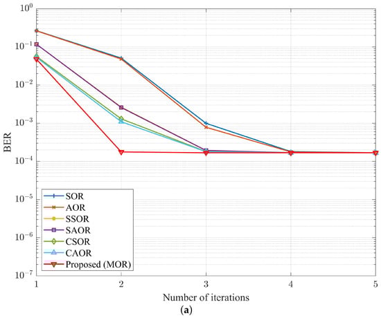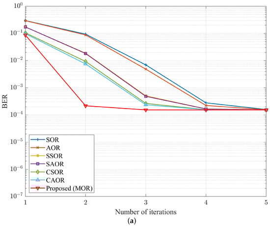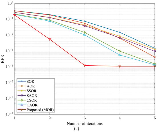 Figure 8 and Figure 9 depict the BER performance comparison of different detection methods when the iteration number i was 3 and 4, respectively. Among them, Figure 8a and Figure 9a apply to the OFDM system, and Figure 8b and Figure 9b apply to the UFMC system. In Figure 8a,b, we can observe that when the iteration number i was equal to 3, our proposed method was already close to the performance of the MMSE. Moreover, when the SNR was at 40 dB, we compared the BER performance of MOR and related it to that of the CAOR, and for the OFDM system, it was approximately and , respectively, an improvement of . The UFMC system’s results were roughly and , respectively, an improvement of . As shown in the numerical values, the BER performance of our new method was significantly improved compared with CAOR, let alone other iterative detection methods. In addition, as shown in Figure 9a,b, when the iteration number i was equal to 4, the BER performance of our method overlapped with the MMSE method.