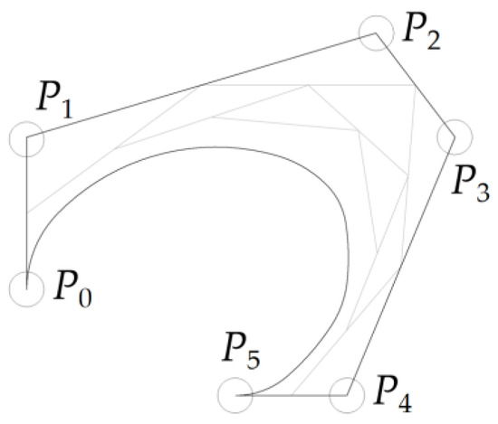 Compared to other path planning methods, the A* algorithm has the advantages of low computational complexity and high accuracy. However, as indicated by Equation (1), the path generated by the A* algorithm is generally a sequence of scattered points, resulting in many turning points and sudden changes in curvature. This path may not necessarily conform to the kinematic principles of the agricultural machinery. Therefore, parametric curves such as Dubins curves [31] and clothoids [32] are used in path planning, as they require less computation. On the other hand, these curves are not practical because they cannot generate closed paths [33]. Moreover, most curve-based path planning techniques rely on the interpolation of reference points, with the resulting curve passing through all reference points. This approach often results in longer paths compared to the Bezier curve, since these curves only pass through the first and last control points [34]. The Bezier curve is used in various fields, such as face recognition [35], medical imaging [36], computer graphics and animation [37], path planning for robots [38,39,40], etc. The fifth-order Bezier curve is formed for the path of the wheeled mobile robot with the constraints of speed, acceleration, and jerk [41]. To address this issue, we use a fifth-order Bezier curve to smooth the path generated by the traditional A* algorithm. The Bezier curve is capable of describing complex polygons [42]. First, we connect the start and end points of the path to form a polygon. Then, we approximate this polygon using the Bezier formula to obtain the parameters of the Bezier curve (as shown in Figure 1). The points that determine the direction of the curve are called control points, and the polygon formed by connecting these points is called the control polygon.