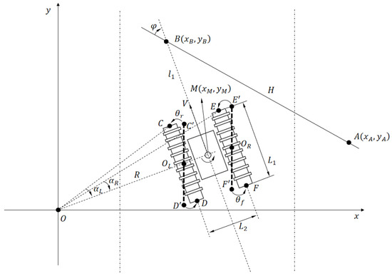 As shown in Figure 3, xOy represents the Cartesian coordinate system. The line on which AB lies (denoted as H) is the desired path; CD represents the inner track, with C being the front point of the inner track. EF represents the outer track. C′D′ and E′F′ represent the tracks before adjustment. M is the centroid of mass of the fuselage; OL and OR are the centers of the inner and outer tracks, respectively. φ represents the angle between the current velocity direction and the desired path, which is the desired value of the heading angle. From the geometric relationship in Figure 3, we have that